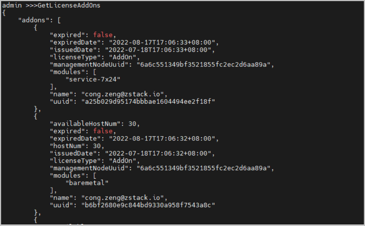 [root@localhost ~]# zstack-cli admin >>> LogInByAccount accountName=admin password=$password //密码为平台admin用户密码 admin >>> GetLicenseAddOns