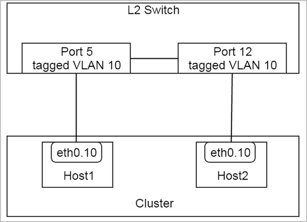 在上图这个配置中,交换机的两个端口5和12是带VLAN 10标签(tagged VLAN 10)的端口(Cisco中的VLAN 10干线端口,即trunk port), 并且分别连接到host1和host2上预先创建好的VLAN设备eth0.10。 对于L2NoVlanNetwork来说,这同样是一个有效的配置。管理员可以使用physicalInterface = eth0.10创建L2NoVlanNetwork,并挂载到集群。