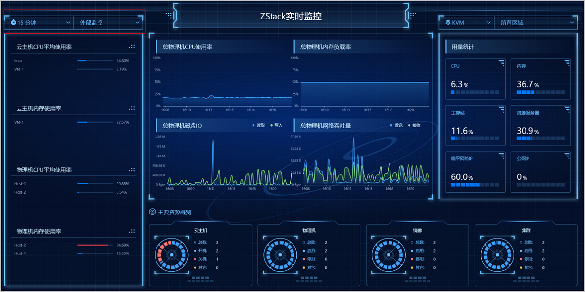 ZStack Cloud 4.7.11对监控大屏进行优化,支持自定义监控时间范围和监控方式,包括外部监控和内部监控两种方式。用户可根据实际需求,使大屏灵活展示所需的监控数据。