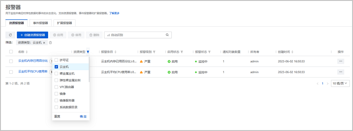 ZStack Cloud 4.7.11开始,资源报警器支持按资源类型筛选,用户指定资源类型即可快速过滤出该资源对应的全部报警器。