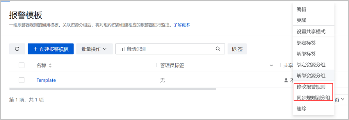 ZStack Cloud 4.7.11开始,报警模板新增修改报警规则和同步规则到分组操作。用户可为已创建的报警模板修改报警规则,并将修改后的新规则一键同步到已绑定的资源分组。