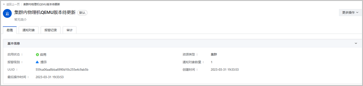 新增默认事件报警器集群内物理机QEMU版本待更新