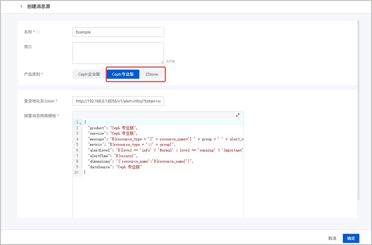 ZStack Cloud 5.4.2开始,扩展报警支持对接Ceph专业版、ZStack ZStone。用户添加对应产品类别的消息源后,即可在ZStack Cloud接收来自Ceph专业版、ZStack ZStone的报警消息,进一步实现存储告警统一管理,提高集中运维效率。