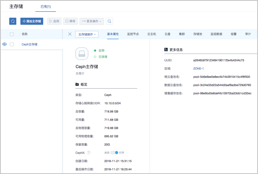 ZStack 3.1.1针对Ceph企业版存储容量展示进行改进优化,在Ceph主存储/镜像服务器详情页,采用更细粒度的计算策略来展示Ceph存储实际可用的总容量和可用量,容量显示更加精准易懂,并新增展示保留容量。如图 1所示: