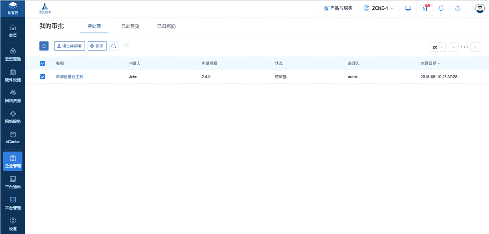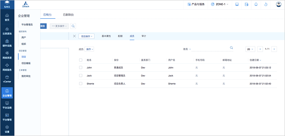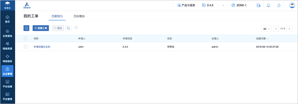 企业管理是ZStack 2.4.0重磅推出的核心功能,也是云计算的特色功能之一。在ZStack 2.4.0中,企业管理以单独的功能模块形式提供给用户,主要包括项目管理工单审批独立区域管理三个部分。