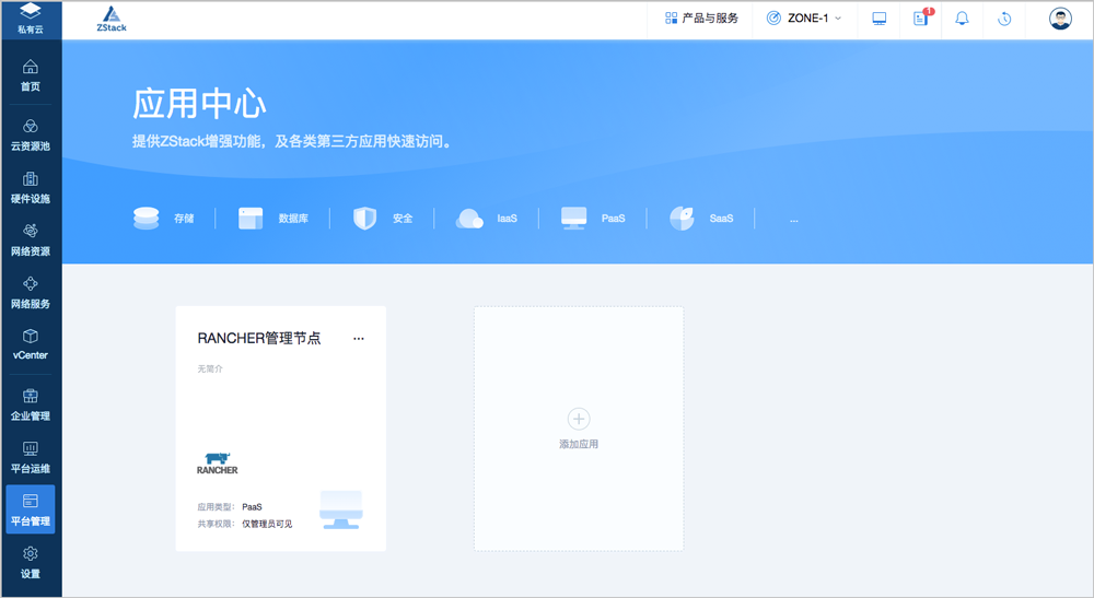 ZStack 2.4.0新增应用中心,作为一个开放平台为用户提供全面立体的云服务,支持添加各种类型的第三方应用入口,包括存储、数据库、安全、以及各类IaaS、PaaS、SaaS服务。