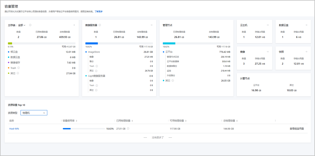 在ZStack Cloud主菜单,点击,进入容量管理界面。