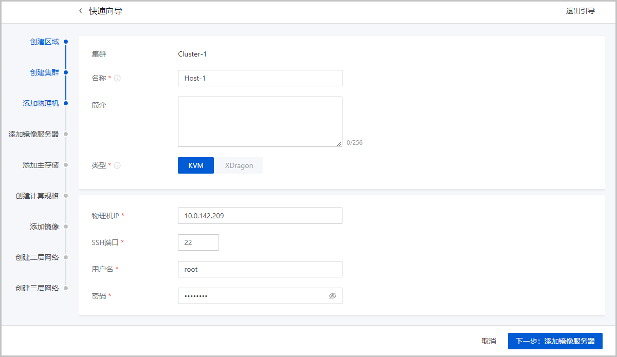 #创建一个名为test的普通用户 [root@localhost ~]# adduser test #授权test用户拥有sudo权限 [root@localhost ~]# echo "test ALL=(ALL) NOPASSWD: ALL" >>/etc/sudoers若Wizard引导设置结束后,要在同一区域的同一集群中再添加其它物理机,则对应主机需安装相同的操作系统。SSH端口、用户名、密码无须相同。