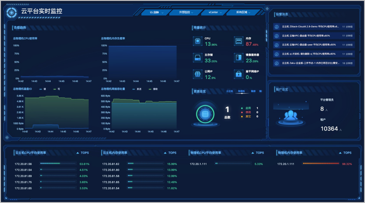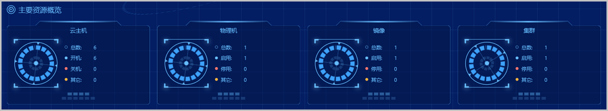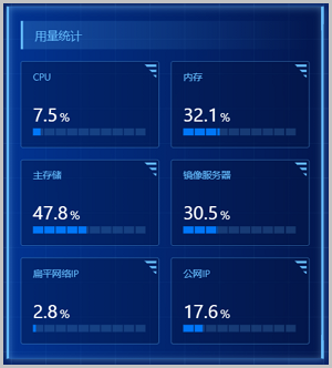 通过对所选虚拟化、区域中数据中心的相关物理资源使用情况进行统计分析,挑选出CPU、内存、主存储、镜像服务器、私网IP、公网IP、GPU、vGPU等资源,对它们的资源用量分别进行实时展示监控,实时显示的比例结合进度条的蓝、黄、红三色提示可直观告知用户当前资源的使用量。