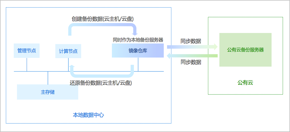 支持将公有云上的存储服务器作为公有云备份服务器,用于存放本地云主机/数据云盘/云平台数据库的定时备份数据。备份数据需通过本地备份服务器同步至公有云备份服务器。