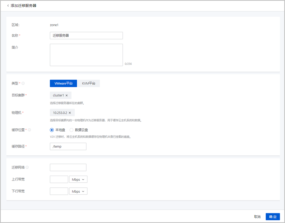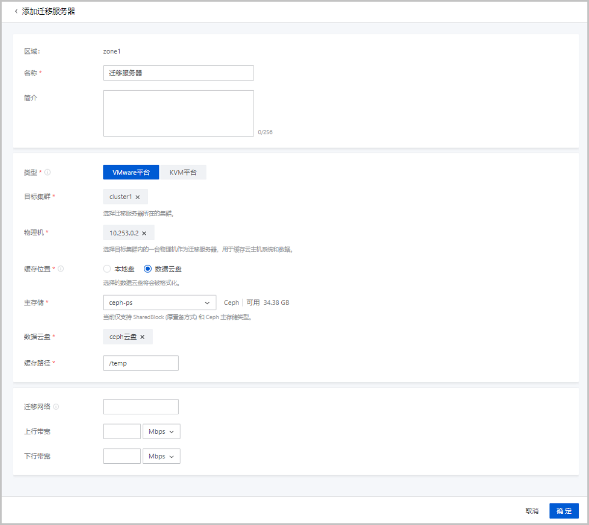 | 设置网络带宽 | 设置迁移服务器的上行/下行带宽。 |