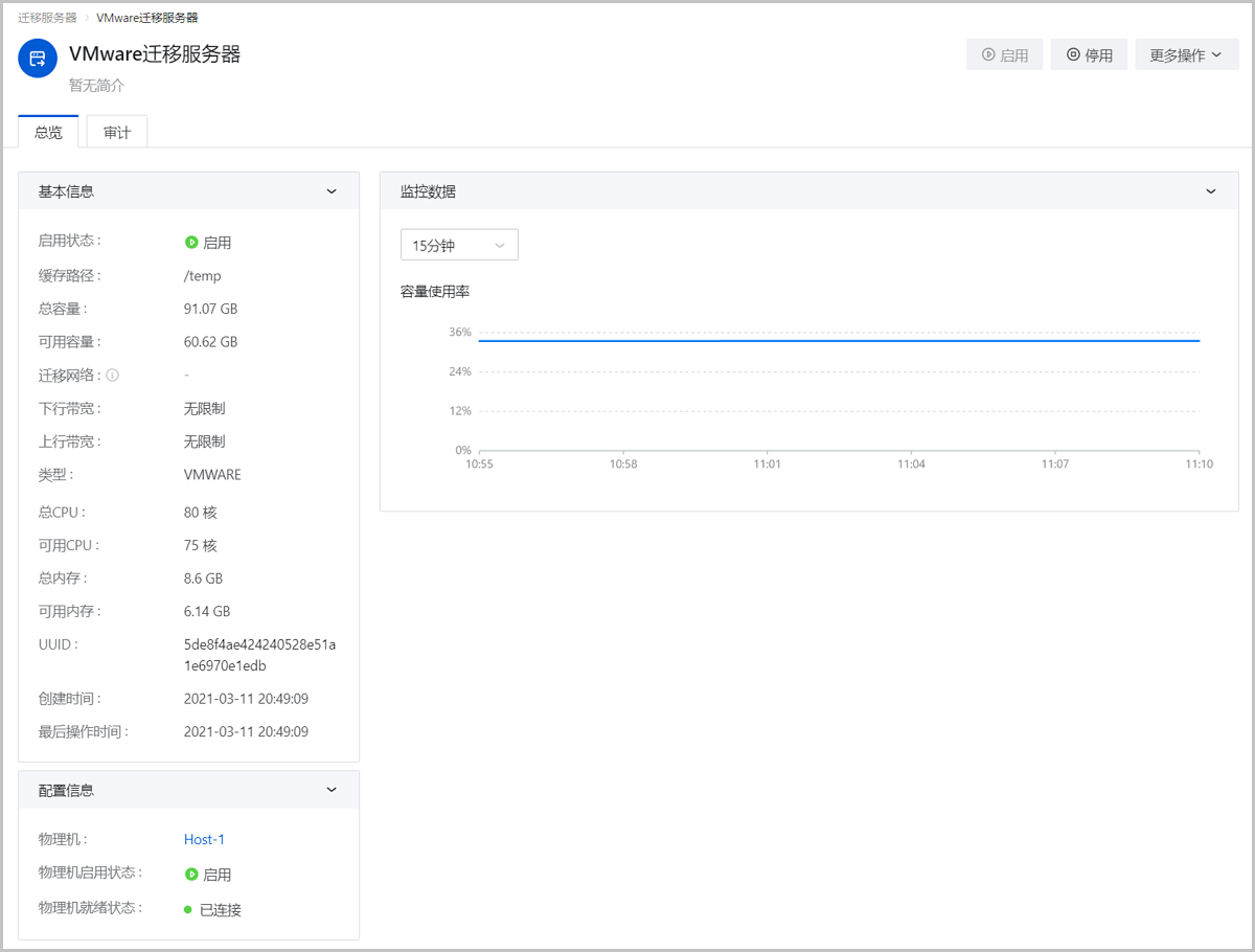 | 停用迁移服务器 | 将已启用的迁移服务器停用。 说明: 若在V2V迁移任务执行过程中将迁移服务器停用,迁移任务不受影响。 |