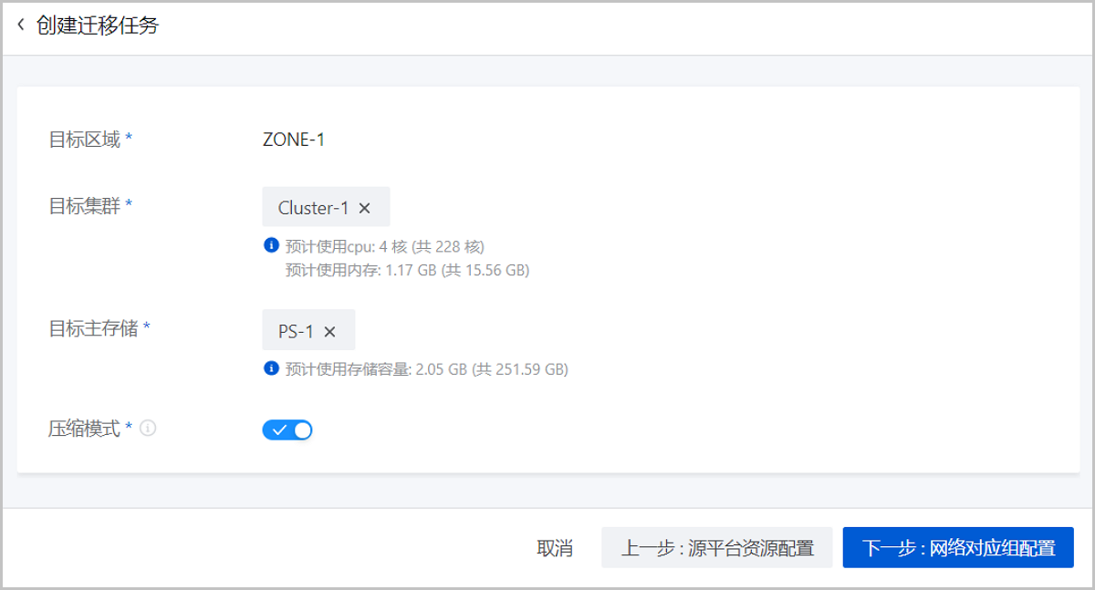 • 预计内存使用情况:源云主机的内存占用容量/目标集群的可用内存总容量。