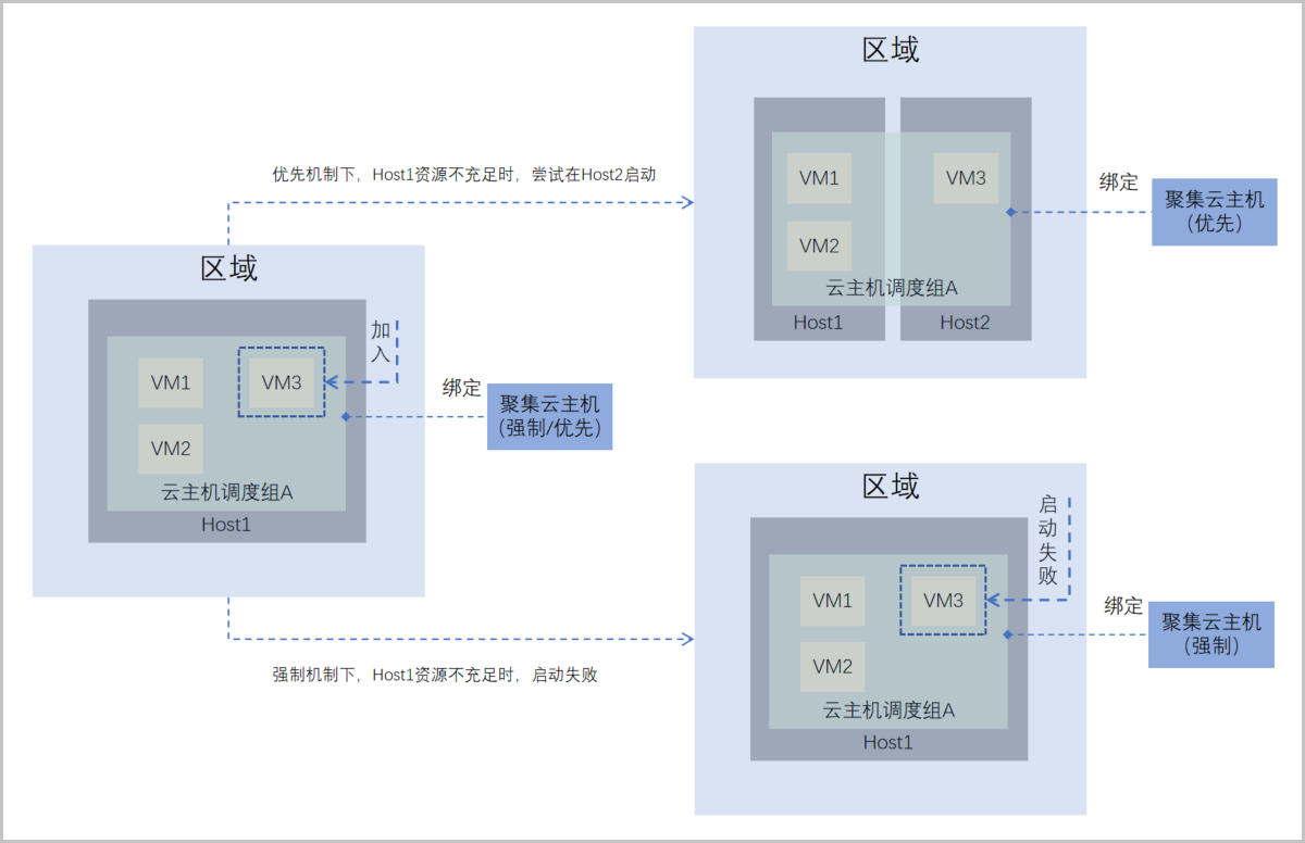 场景2:假定区域内有两台物理机Host1和Host2。云主机调度组A已绑定聚集云主机调度策略,且云主机VM1和VM2已加入该调度组,并运行在物理机Host1上。此时将云主机VM3加入该调度组,不同执行机制下云主机VM3行为如下: