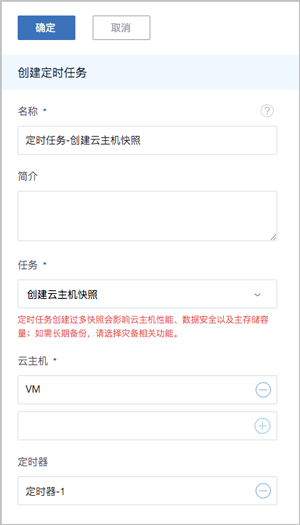 在生产环境中,建议单块磁盘的快照数量尽量控制在5以内,快照过多会影响云主机/云盘的IO性能、数据安全以及主存储容量。不建议进行高频的定时快照备份。如需长期备份,请选择灾备相关功能。