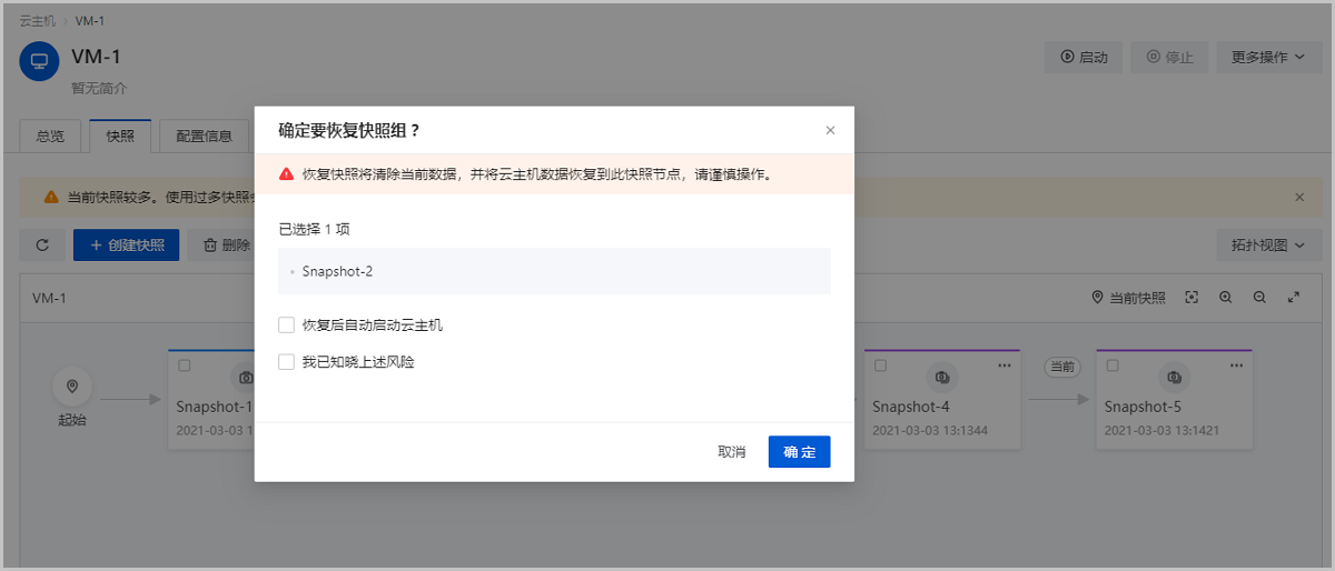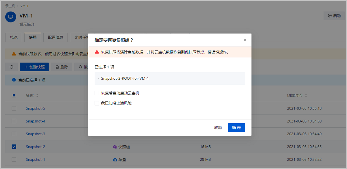 在ZStack Cloud主菜单,点击,进入云主机界面。选择某一云主机(已停止),在云主机详情页的快照子页面,选择某一单盘快照,点击恢复,弹出恢复快照确认框。