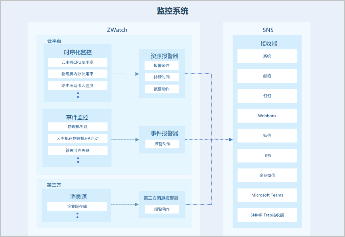 监控报警功能支持对时序化数据和事件进行监控,并通过通知服务(SNS)推送报警消息至指定的通知对象。支持资源报警器、事件报警器和扩展报警器三种报警器类型,支持系统/邮箱/钉钉/企业微信/飞书/Webhook/短信/Microsoft Teams/SNMP Trap接收端通知对象类型,部分资源报警器需安装性能优化工具才能使用。